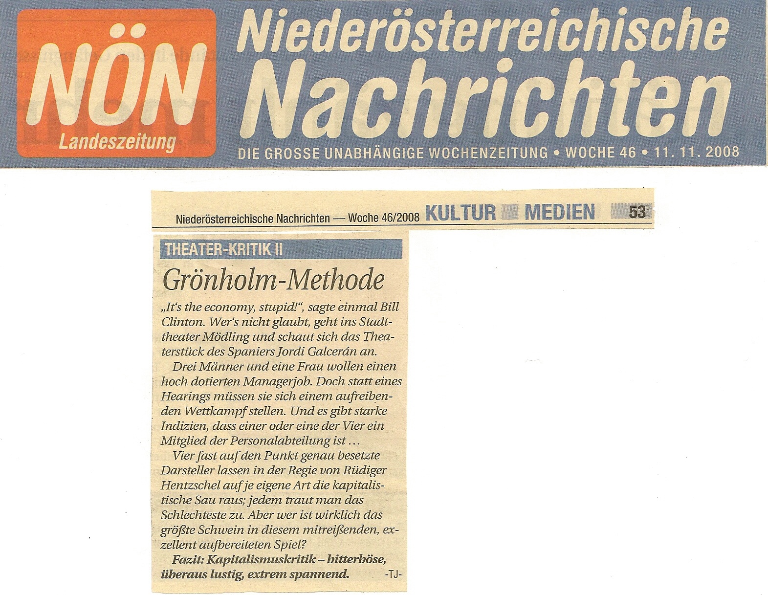Grönholm-Methode "It's the economy, stupid", sagte einmal Bill Clinton. Wer's nicht glaubt, geht ins Stadttheater Mödling und schaut sich das Theaterstück des Spaniers Jordi Galercán an.